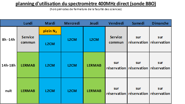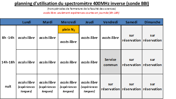 Le spectromètre « 400 inverse », optimisé pour la détection du proton, est utilisé sous forme d’accès libre. Les expériences longues (expériences hétéronucléaires à deux dimensions notamment, supérieures à 15 minutes) sont automatiquement lancées sur la nuit (18h-8h).